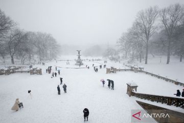 Sejumlah orang berjalan-jalan di Central Park saat badai salju lebat menerjang sebagian besar wilayah Amerika Serikat di Kota New York, Amerika Serikat, Minggu (25/1/2026). Menurut Badan Layanan Cuaca Nasional Amerika Serikat, hujan salju lebat dan lapisan es berbahaya diperkirakan terjadi di wilayah yang membentang dari Texas bagian timur hingga Carolina Utara. Keadaan darurat telah diumumkan di 20 lebih negara bagian. ANTARA FOTO/REUTERS/Eduardo Munoz/wsj.