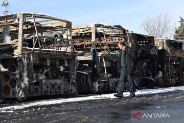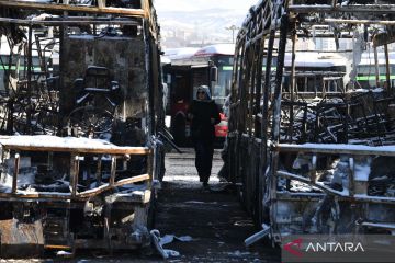 Seorang laki-laki berjalan di dekat bangkai-bangkai bus yang hangus terbakar akibat dari gelombang protes dan demonstrasi terakhir di Tehran, Iran, Rabu (21/1/2026). Data Organisasi Kedokteran Forensik Iran menyebut sedikitnya 3.117 orang tewas selama gelombang protes dan demonstrasi terakhir. ANTARA FOTO/Xinhua/Shadati/wsj.