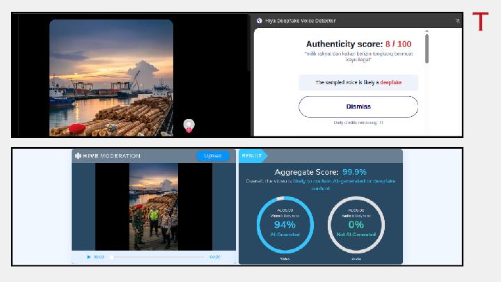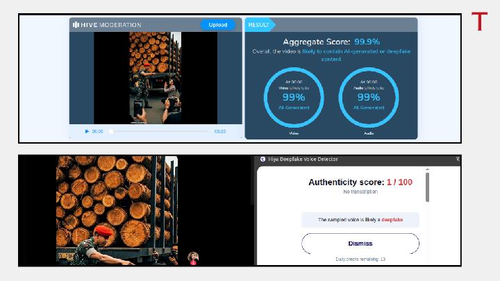 Another detection tool, Hive Moderation, shows a 99.9 percent probability that the video contains AI elements. Meanwhile, Hiya Deepfake Voice Detector states that 99 percent of the audio was created with generative AI.