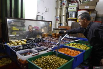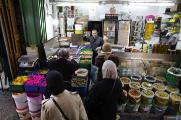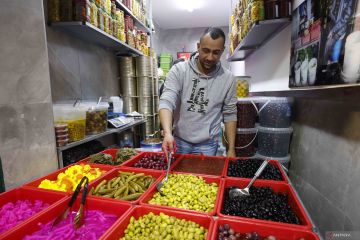 Warga membeli berbagai macam acar di sebuah toko saat bulan suci Ramadhan di Kota Tua Yerusalem, Minggu (22/2/2026). ANTARA FOTO/Xinhua/Jamal Awad/wsj.