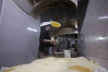 Seorang penjual membuat kue manis yang dikenal sebagai Qatayef selama bulan suci Ramadhan di Kota Tua Yerusalem, Minggu (22/2/2026). ANTARA FOTO/Xinhua/Jamal Awad/wsj.